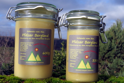 schleudern wir Anfang Juni nur ein bisschen oder gar keinen Honig und belassen die Honigvorräte, bis auf die schnell kristallisierenden, fast vollständig in den Bienenstöcken. Dadurch, dass wir am Ende des Frühlings viel Honig den Biens überlassen, können sie den trachtarmen Juni bis zur Linden- und Kastanienblüte ohne Hungerzeiten überstehen und entwickeln sich besser in eine gute Winterstärke. Manchmal sammeln diese Biens dann besonders eifrig den Sommernektar und den Honigtau. Aber natürlich kann auch ein nasskalter Sommer dazwischen kommen. Wir haben von diesen Biens oder in solch trachtarmen Jahren keine "getrennten" Honige ( z.B. Pfälzer Frühling & Pfälzer Sommer ), sondern nur einen Honig, der das ganze Bienenjahr des Nordpfälzer Berglandes repräsentiert: